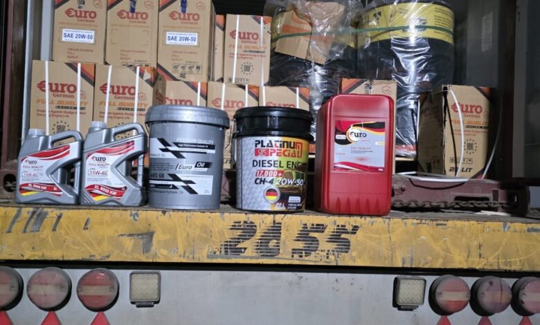 وفي إطار الجهود الرقابية ذاتها، وبالاشتراك مع شرطة الكمارك واستخبارات شرطة الكمارك، تم ضبط عجلة واحدة في سيطرة باوة محمود المحملة بمادة ( زيوت محركات ) علامة (ايرو) وحسب ما مثبت على الحمولة ذات المنشا الألماني مع (ملصق موسوم ) صنع في العراق (غش تجاري) اللازمة وفق السياقات المعتمدة.