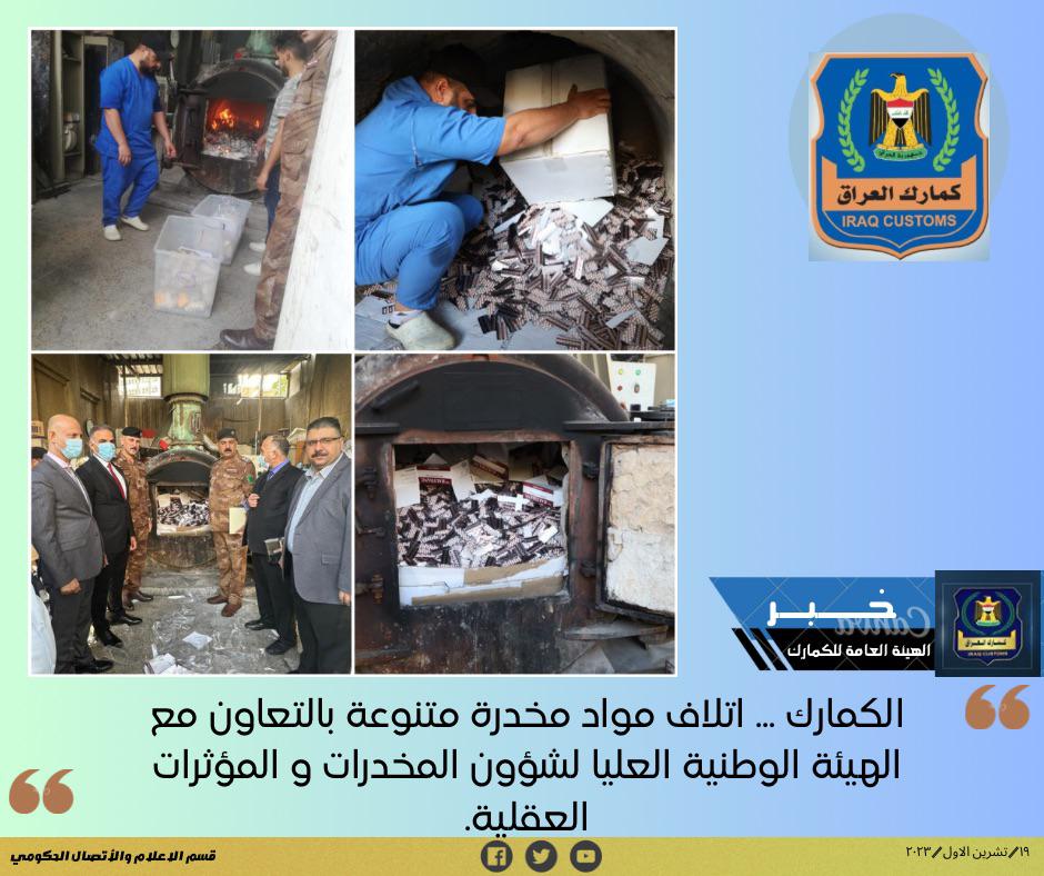 أعلنت الهيئة العامة للكمارك مشاركتها في عملية اتلاف مواد متنوعة من المواد المخدرة و المؤثرات العقلية من خلال ممثلها في اللجنة الخاصة المكلفة لاجل هذا الغرض وبالتعاون مع وزارة الصحة و اللجنة الوطنية العليا لشؤون المخدرات والمؤثرات العقلية ، و قد تم اتلاف اكثر من ( ٤٦,٩ ) ستة واربعون كيلوغرام وتسعة غرام من مادة الكبتاكون و ( ١,٠٤٠,٠٠٠ ) مليون واربعون الف قرص من مادة الأرتان الذي يعادل وزن ( ٢٢١ ) مائتان وواحد وعشرون كيلو غرام من مادة الأرتان .