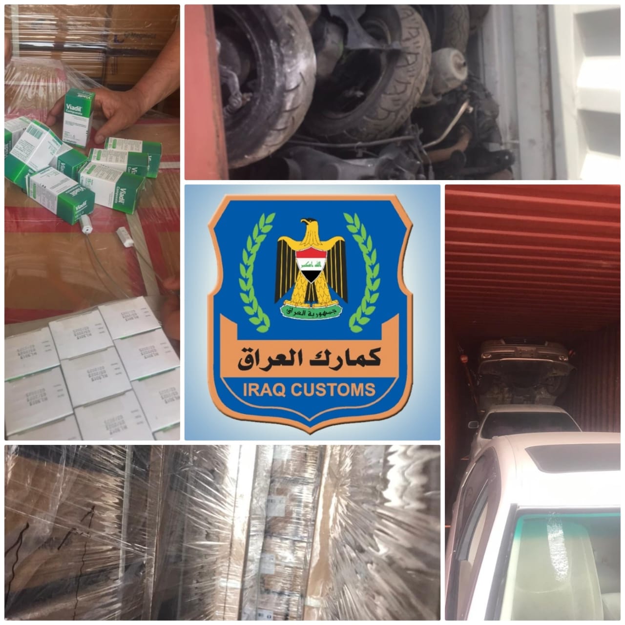 الكمارك تضبط١٧ حاوية تحتوي سيارات ودراجات وادوية بشرية مخالفة في مركز كمرك ام قصر الشمالي