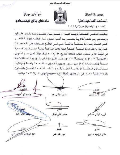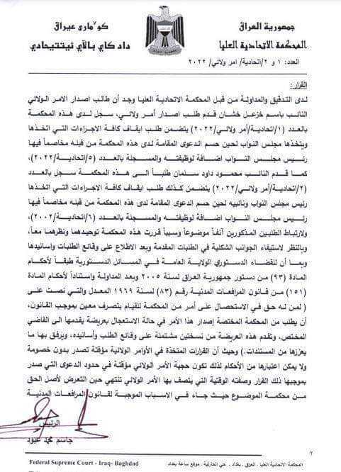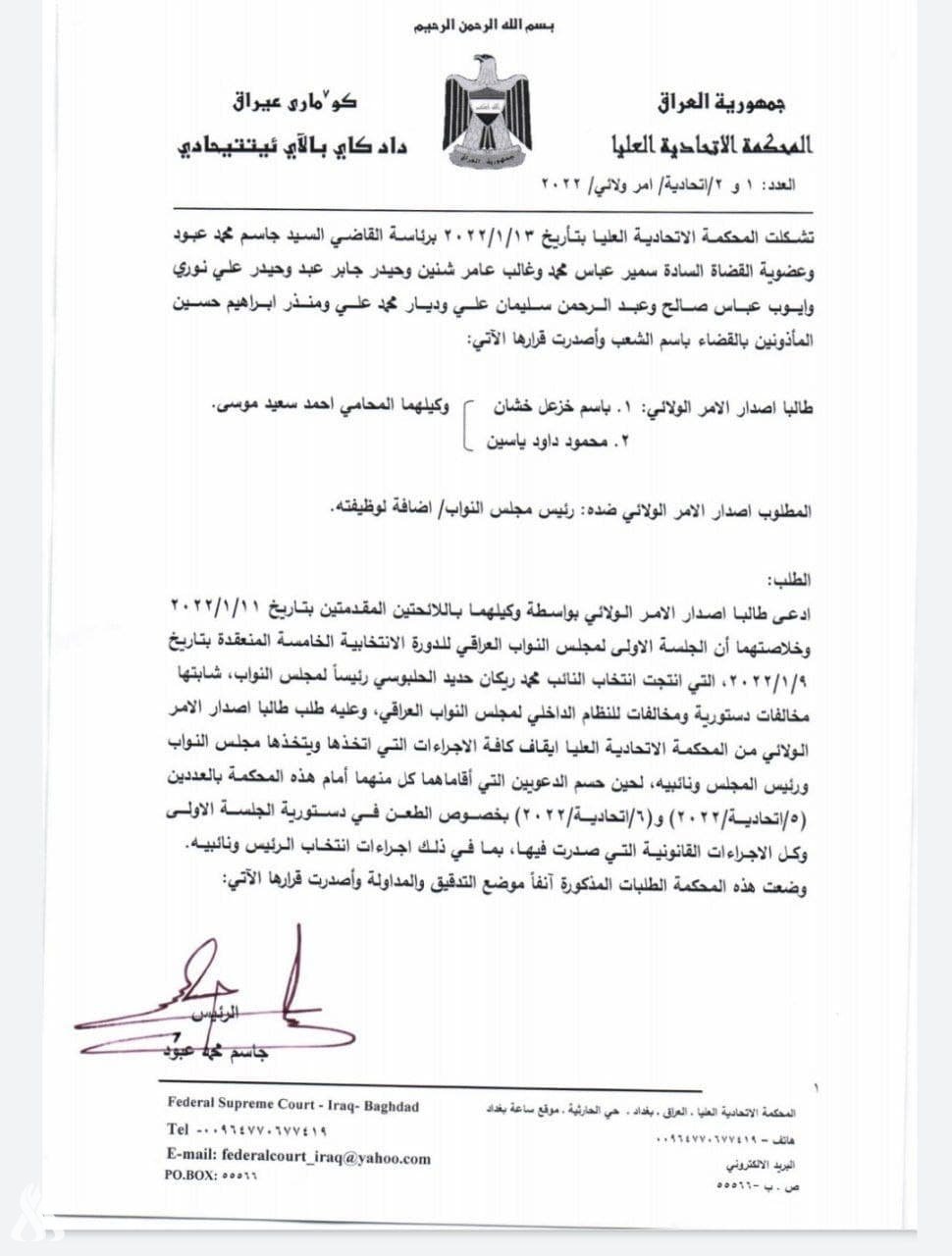 وبحسب وثائق حصل عليها “وام” (13 كانون الثاني 2022)، فإن قرار المحكمة بإيقاف عمل هيئة رئاسة البرلمان التي انتخبت الأحد الماضي، جاء بناءً على طلب تقدمه به النائب باسم خشان والنائب محمود داود، بإصدار أمر ولائي ضد رئيس مجلس النواب محمد الحلبوسي ونائبيه الى حين حسم الدعوتين المقامة بشأن الجلسة الأولى البرلمان.