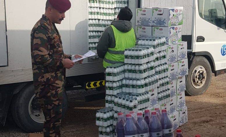 _ تم إحالة عجلة محملة بمادتي خل وألبان وتم إخفاء مادة الخل خلف مادة الألبان ولم يصرح بها بهدف التهريب.