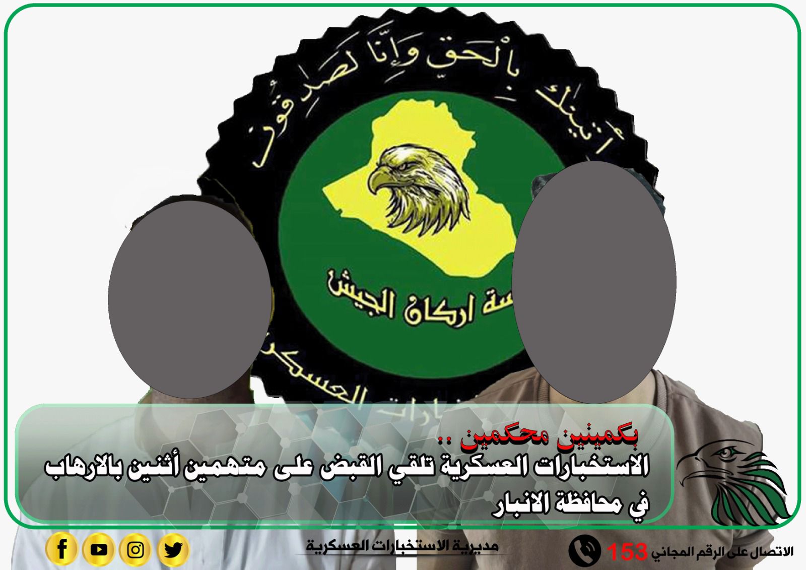 بناءً على معلومات استخبارية دقيقة لشعبة الفرقة العاشرة التابعة الى مديرية الاستخبارات العسكرية وبالتعاون مع استخبارات وقوة من اللوائين الثامن والثلاثين والأربعين ومن خلال كمينين محكمين في منطقة ابو طيبان وسيطرة الصقور، ألقي القبض على متهمين إثنين مطلوبين للقضاء وفق احكام المادة الرابعة من قانون مكافحة الارهاب في قضائي الرمادي والفلوجة، ينتميان الى عصابات داعش الإرهابية، وقد جرى تسليمهما الى جهة الطلب أصولياً بعد اكمال الاجراءات اللازمة بحقهما.