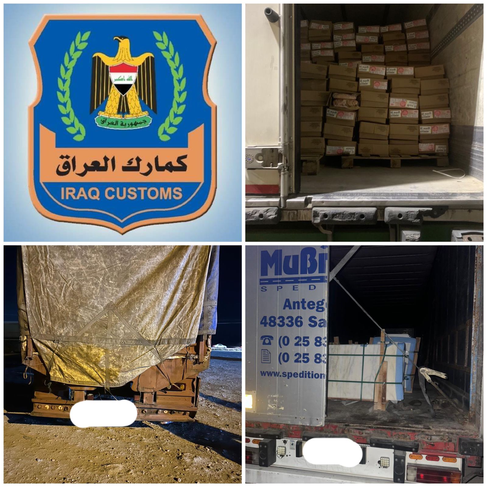 ضبط ( ٣٥ ) شاحنة في مديرية كمرك المنطقة الشمالية محملة ( مواد غذائية متنوعة و مكائن لتقطيع المرمر و ادوات انابيب بلاستيكية و مواد اولية لصناعة الاصباغ و سيراميك و مبردات هواء و بوري و شيلمان حديد و بطاريات سيارات و ادوية بيطرية و مسحوق غسيل تايت و ادوات منزلية و ملابس و مواد مختلفة اخرى) .