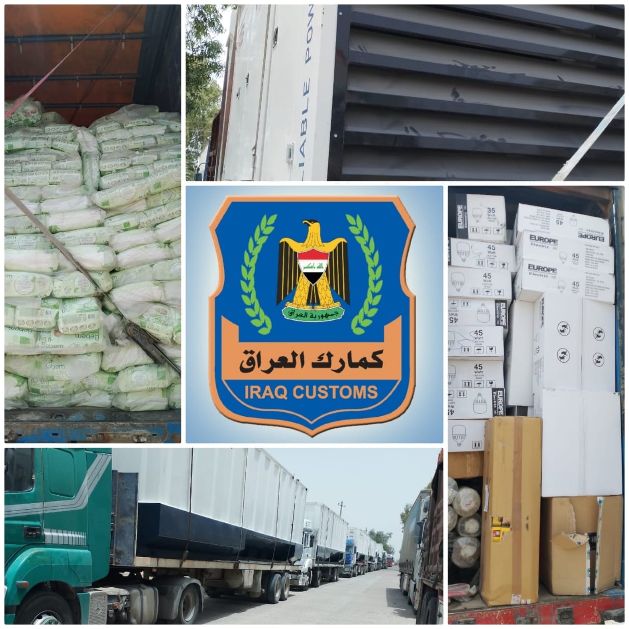 اعلنت الهيئة العامة للكمارك اليوم الأثنين المصادف ١٢ حزيران ٢٠٢٣ عن تمكن قسم التحري و مكافحة التهريب في مديرية كمرك المنطقة الوسطى من ضبط ( ١٤ ) شاحنة محملة ( خزان ماء حديد و مولدات كهربائية و الواح تصوير اشعة وصحيات ومواد متنوعة اخرى) مخالفة للشروط و الضوابط الاستيرادية النافذة.