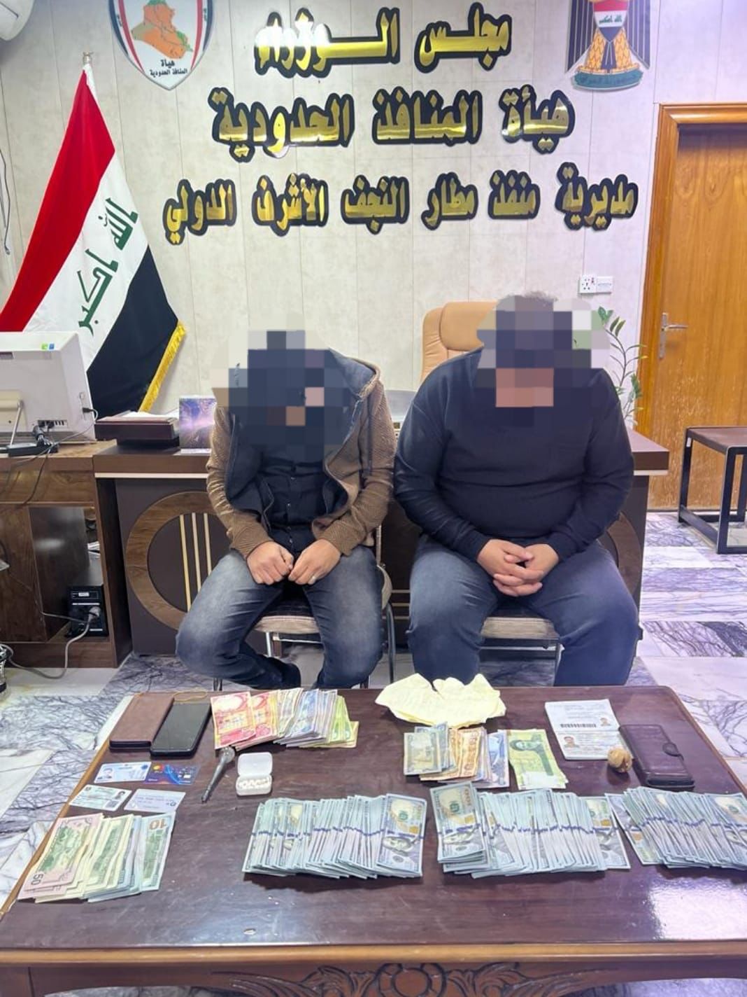 القبض على سائق عراقي ومسافر أجنبي بحوزتهما حبوب مخدرة و مبلغ متجاوز الحد المسموح في منفذ مطار النجف