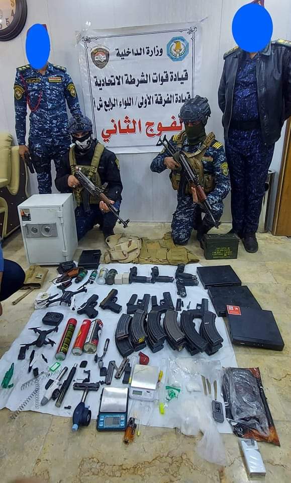 تمكنت قوة من اللواء الرابع الفرقة الأولى بالإشتراك مع مفرزة من استخبارات اللواء ومفرزة من مكتب مكافحة مخدرات البياع من مداهمة دار أحد المطلوبين للقضاء وفق احكام المادة ( ٢٨ مخدرات ) في منطقة الزعفرانية ضبط بداخلها بعد التفتيش على ( 1كيلو و 33 غرام من مادة الحشيشة المخدرة ، 350 من مادة الكريستال المخدرة ، 3 ميزان الكتروني ، 3 سكائر حشيشة ، 9 بايب تعاطي ، 4 قداحة ، 15 قرص مخدر ، 5 مسدس صوتي محور ، 15 مخزن بندقية ، 200 إطلاقة عتاد بندقية، 2 رمانة صوتية ، 2 رمانة دخانية ، 2 طائرة مسيرة ، 3 جهاز DVR ، قاصة حديد ) . تم تسليم جميع المواد المضبوطة اصوليا إلى الجهات المختصة لإكمال الإجراءات التحقيقية والقانونية .