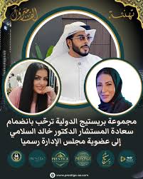 قد تكون صورة ‏‏شخص أو أكثر‏ و‏تحتوي على النص '‏שמישיני .: مجموع عة بريستیج الدولية ترحّب بانضمام سعادة المستشار الدكتور خالد السلامي إلى عضوية مجلس الإدارة ارة رسميا PRESTIGE PRESTIGE لقصة مالا يسرُ مجلس إدارة مجموعة بريستیج الدولية أن يُعرب عن بالغ اعتزازه وتقديره بانضمام‏'‏‏