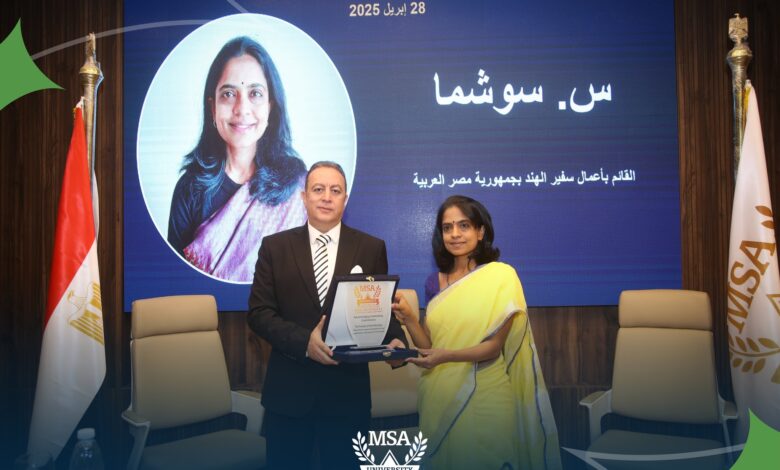 قد تكون صورة ‏‏‏‏٣‏ أشخاص‏، و‏مِنبر‏‏ و‏تحتوي على النص '‏في التعليم والقيادة 28 إيريل 2025 .س سوشما القالم بأعمال سفير الهند بجمهورية مصر العربية LMSA 0に ي ပိိ်် anle VISA SA MSA UNIVERSIT UNIVERSIT อรารเม‏'‏‏