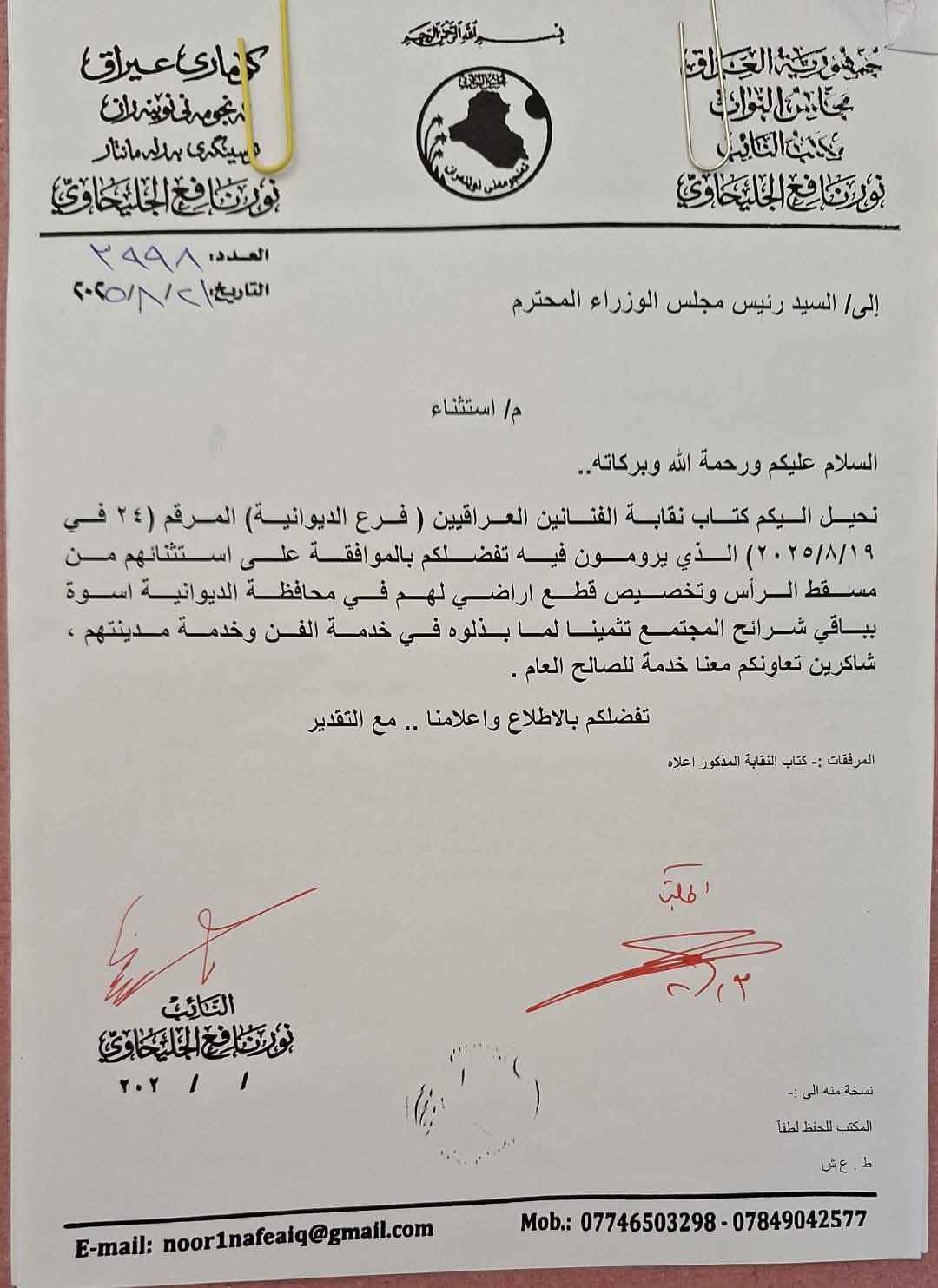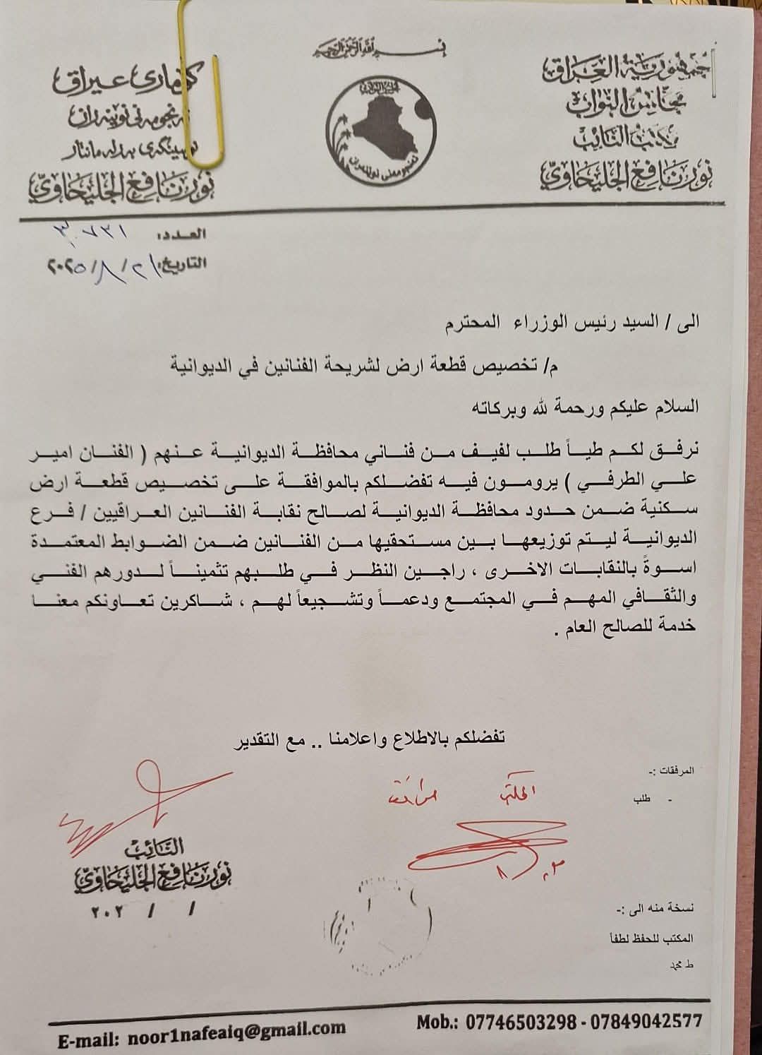 بالوثيقة…النائب نور نافع تستحصل موافقة رئيس الوزراء على تخصيص قطع أراضٍ لفناني الديوانية