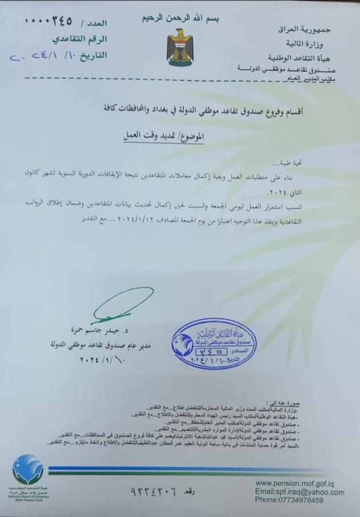 بالوثيقة هيئة التقاعد: يوما الجمعة والسبت دوام رسمي في بناية الوثبة لغرض انجاز وترويج المعاملات وتحديث البيانات