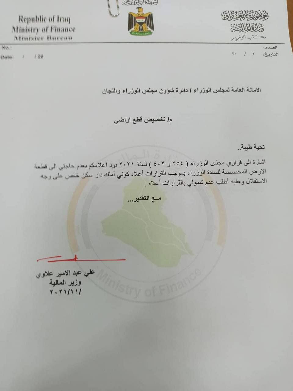 بالوثيقة .. وزير المالية يمتنع عن استلام قطعة الارض المخصصة للوزراء