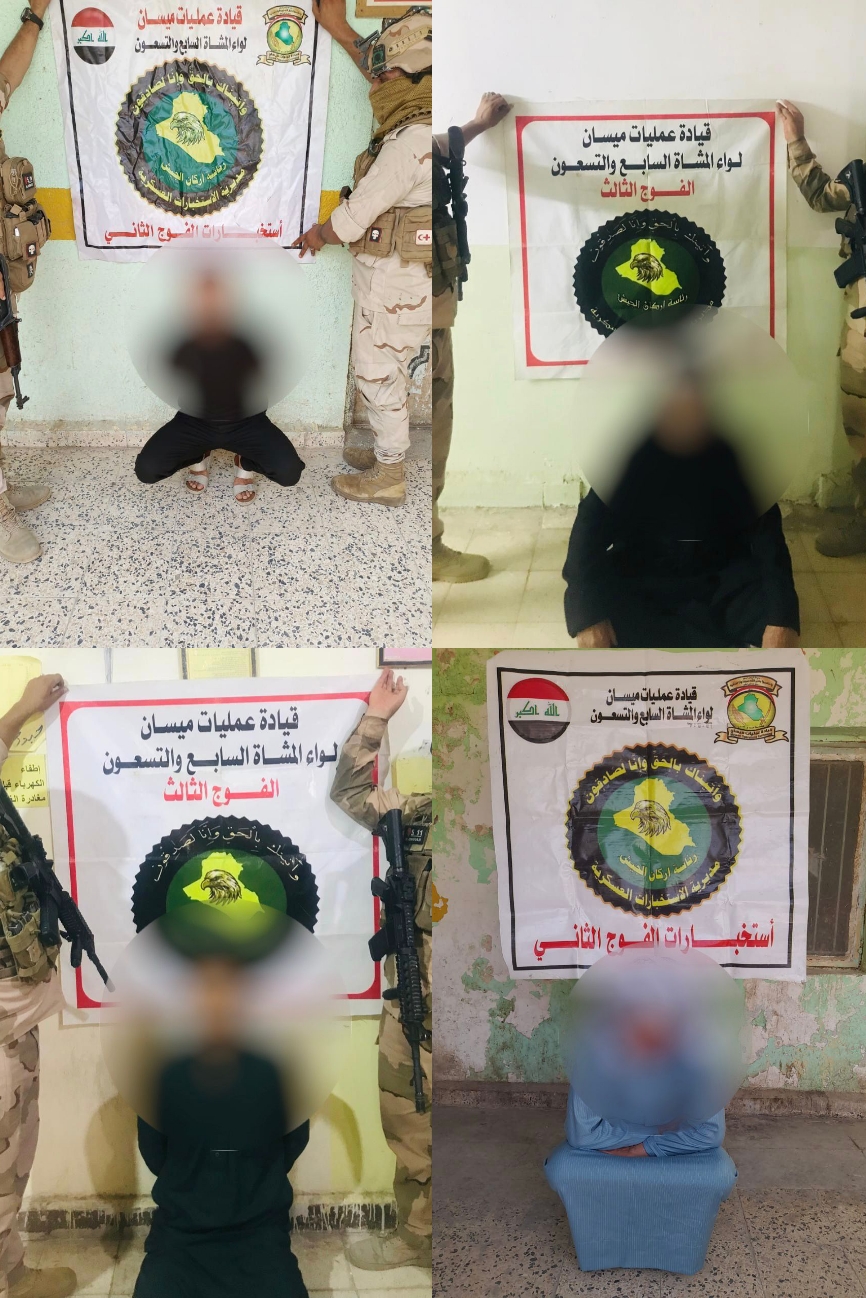 وفي السياق ذاته تمكنت قوة من الفوج الثالث لواء المشاة السابع والتسعون وخلال تنفيذ واجب في قضاء قلعة صالح من القاء القبض على متهمين وفق احكام المادة (٤٣٠/١).