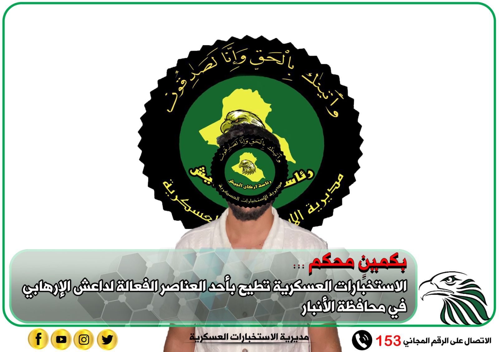بعملية استباقية أستهدفت القبض على أحد الارهابيين من عناصر داعش وإستناداً إلى معلومات استخبارية دقيقة لشعبة الفرقة العاشرة التابعة إلى مديرية الاستخبارات العسكرية وبالتعاون مع استخبارات وقوة من اللواء الأربعين تم إلقاء القبض على احد الارهابيين الفعالين في صفوف داعش الإرهابي بعدما تم نصب كمين محكم في سيطرة الأقواس التابعة إلى قضاء كرمة الفلوجة بمحافظة الأنبار وهو من المدرجين في قاعدة البيانات كونه مطلوب للقضاء وفق احكام المادة 4 ارهاب، وقد جرى تسليمه لجهة الطلب أصولياً.