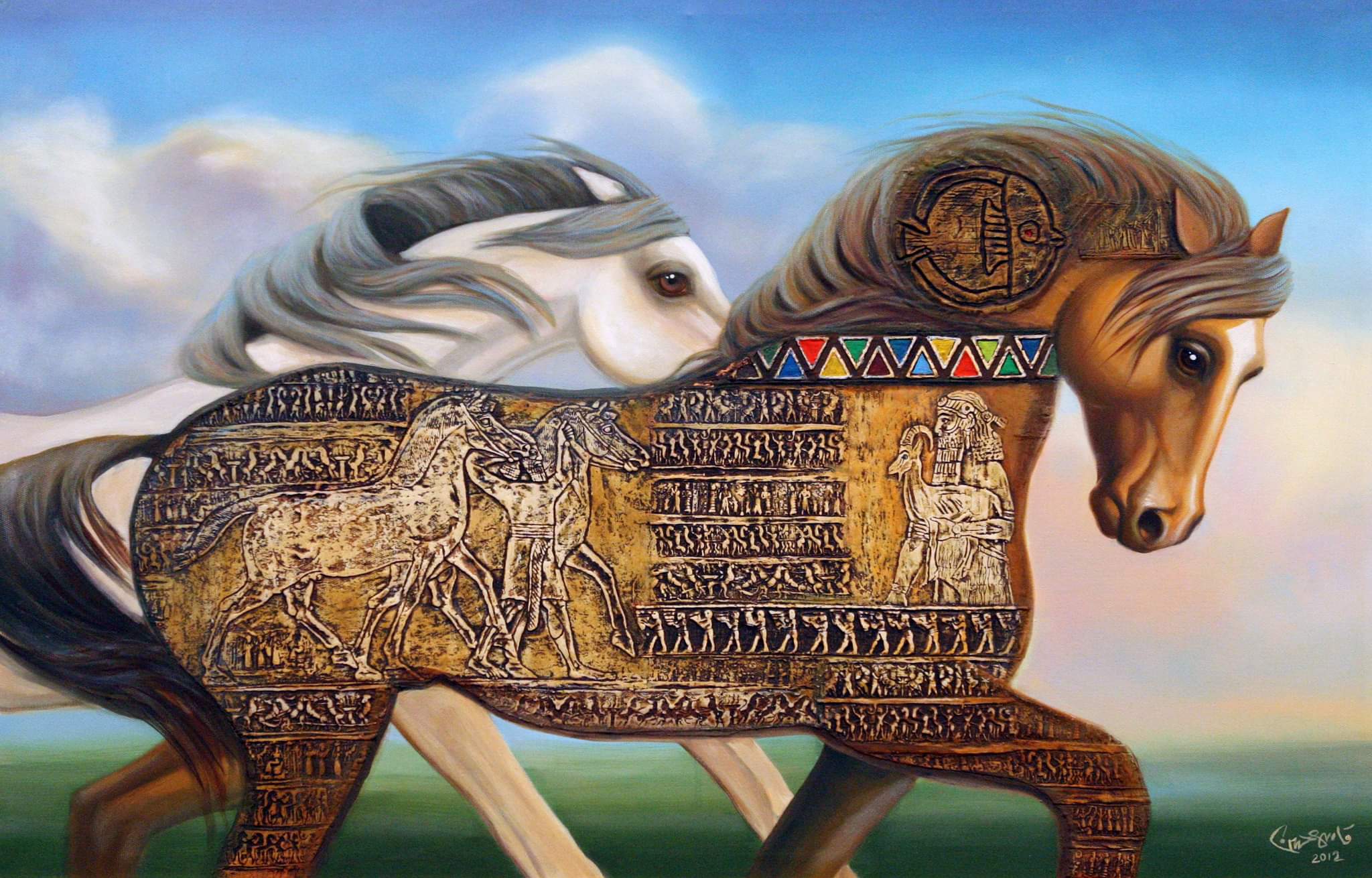 وتضمن المعرض الالكتروني على عشرة لوحات فنية بالألوان الزيتية وباحجام كبيرة، جسدت فيها حضارات العراق بأسلوب استخدمت فيه الرموز القريبة من الكتابة المسمارية والخط والزخرفة العربية، فضلاً عن أشكال الثور والحصان التي كانت ترافق الرسوم التاريخية.