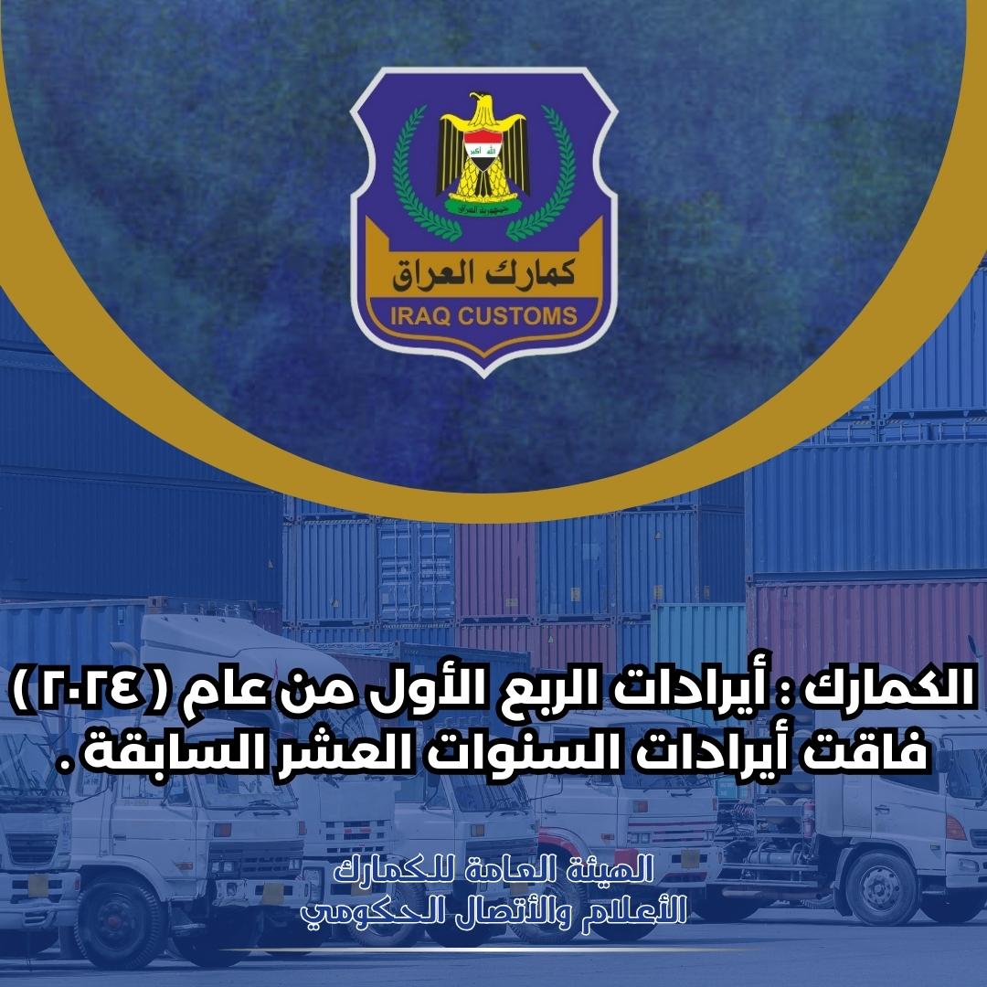 اعلنت الهيئة العامة للكمارك عن ايراداتها خلال الربع الأول من العام الجاري والتي جاءت نتيجة المتابعة في انجاز العمل الكمركي بافضل صورة ممكنة وتبسيط الاجراءات تعكس اهمية وعراقة هذه المؤسسة .