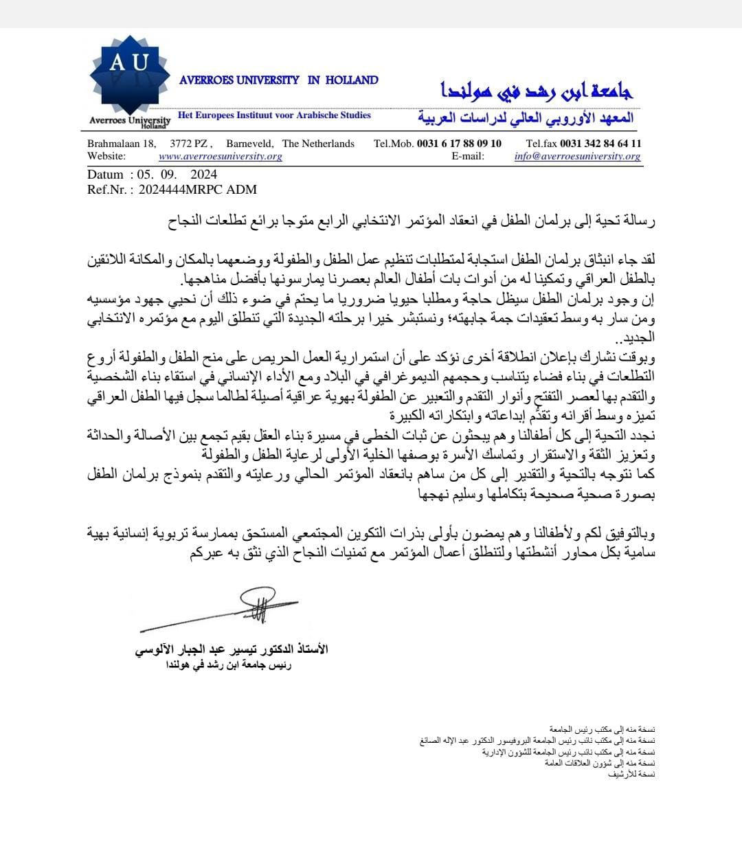 بعثت جامعة ابن رشد في هولندا رسالة تهنئة إلى برلمان الطفل العراقي بمناسبة انعقاد مؤتمره الجديد، معربةً عن فخرها واعتزازها بالإنجازات التي حققها البرلمان في مجال رعاية الطفولة وتقديم الدعم اللازم لها، واعتباره خطوة تاريخية تُمكّن الأطفال من ممارسة حقوقهم واستثمار أدوات العصر الحديث .
