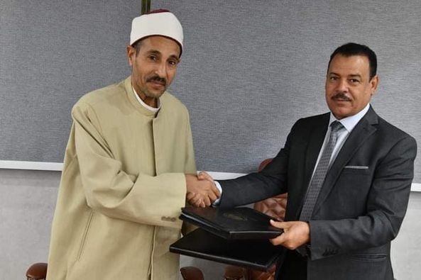 شهد الأستاذ الدكتور عبد العزيز طنطاوي رئيس جامعة الوادي الجديد والدكتور عمر عبد الكريم مدير عام منطقة الدعوة والإعلام الديني بالمحافظة ممثلا عن فضيلة الإمام الأكبر الأستاذ الدكتور أحمد الطيب شيخ الأزهر الشريف توقيع بروتوكول تعاون مشترك في إطار التعاون المستمر والمُثمر بين الجامعة و الأزهر الشريف فى تنظيم ورعاية وإلقاء الندوات والمحاضرات الدينية لنشر الوعى الديني والرد على الشبهات المثارة والرد على تساؤلات طلاب الجامعة وتقديم الجامعة كافة سبل التيسير لتنظيم الندوات