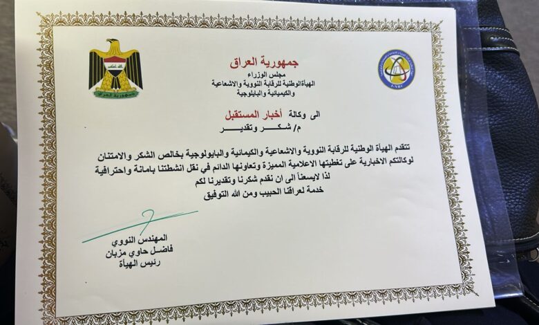 تم تكريم وكالة اخبار المستقبل من اعلام الهيأة الوطنية للرقابة النووية والاشعاعية والكيميائية والبيولوجية