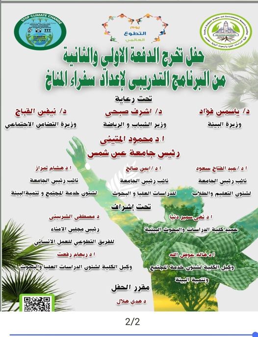 تضامنا مع احتفالات العالم باليوم الدولي للمتطوعين تطلق كلية الدراسات العليا والبحوث البيئية بجامعة عين شمس برئاسة الاستاذة الدكتورة “نهى دنيا “الاثنين المقبل ١٣ديسمبر ٢٠٢١ فى تمام العاشرة صباحا بقاعة كلية الطب حفل تكريم لمتطوعي العمل المناخي، الذين اجتازوا البرنامج التدريبي لتأهيل سفراء المناخ وذلك تحت رعاية وحضور الدكتورة ياسمين فؤاد وزير البيئة والدكتورة نفين القباج وزير التضامن والدكتور اشرف صبحى وزير الشباب والرياضة والوزير المفوض الدكتور محمود فتح اللة رئيس الامانة الفنية لمجلس الوزراء العرب المسؤولين عن شئون البيئة بجامعة الد ول العربية د. محمود المتيني رئيس جامعة عين شمس.وتأتي الفاعلية بالتعاون مع مؤسسة الفريق التطوعي للعمل الانساني ضمن فعاليات مبادرة المليون شاب متطوع للتكيف المناخي برئاسة الدكتور مصطفى الشربينى الرئيس العام للمبادرة والدكتور حسام الدين محمود الامين العام للمبادرةتؤكد عميد كلية الدراسات الاستاذة الدكتورة نهى ان هذا البرنامج هو البرنامج التدريبي الرائد في إفريقيا والشرق الأوسط لمحو الأمية الكربونية والمناخية.