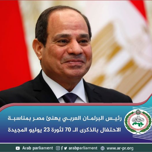 رئيس البرلمان العربي يهنئ مصر بمناسبة الاحتفال بالذكرى الـ 70 لثورة 23 يوليو المجيدة