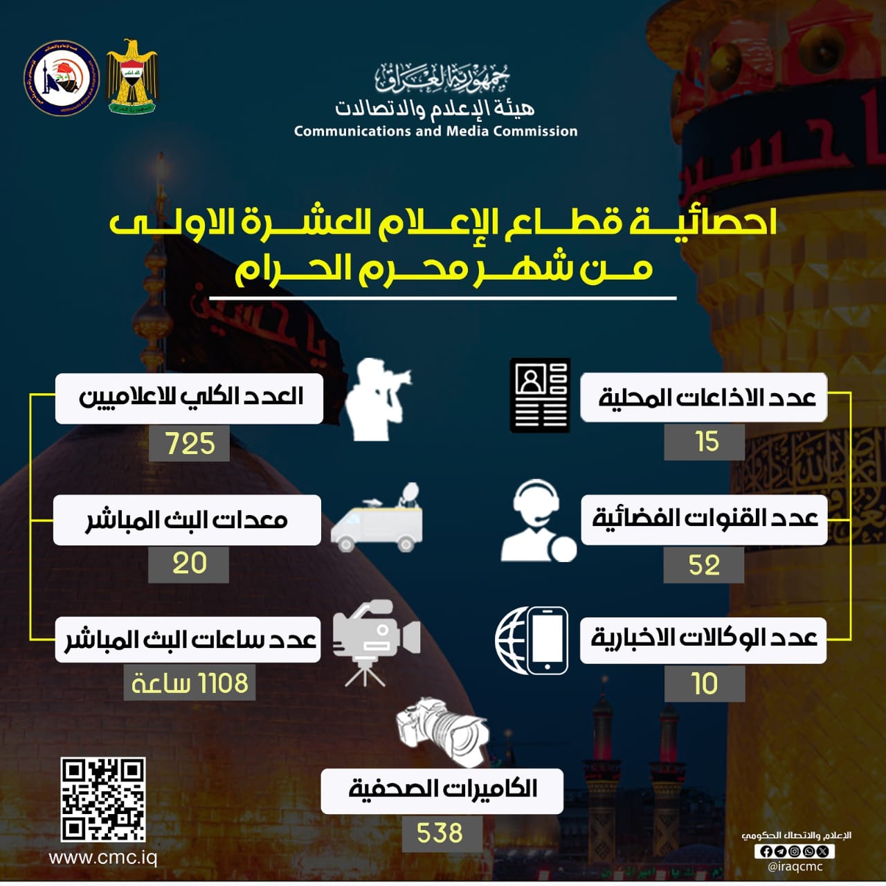 أعلن رئيس هيئة الإعلام والاتصالات الدكتور علي المؤيد عن المؤشرات الإحصائية للتغطية الإعلامية لزيارة عاشوراء بدءاً من الأول من شهر محرم في مدينة كربلاء المقدسة، والتي شهدت حضوراً كثيفاً للإعلاميين والصحفيين من داخل العراق وخارجه.