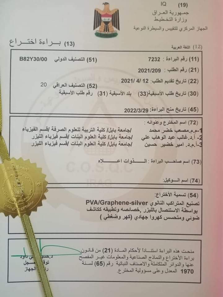 تمكن فريق علمي متخصص في علوم الفيزياء وفيزياء الليزر بجامعة بابل من تصنيع المتراكب النانوي PVA/Graphene-Silver بواسطة الاستئصال بالليزر وتطبيقه ككاشف ضوئي ومتحسس كهرواجهادي “كهروضغطي” ، ليحصل بذلك على براءة اختراع مشتركة من الجهاز المركزي للتقييس والسيطرة النوعية .