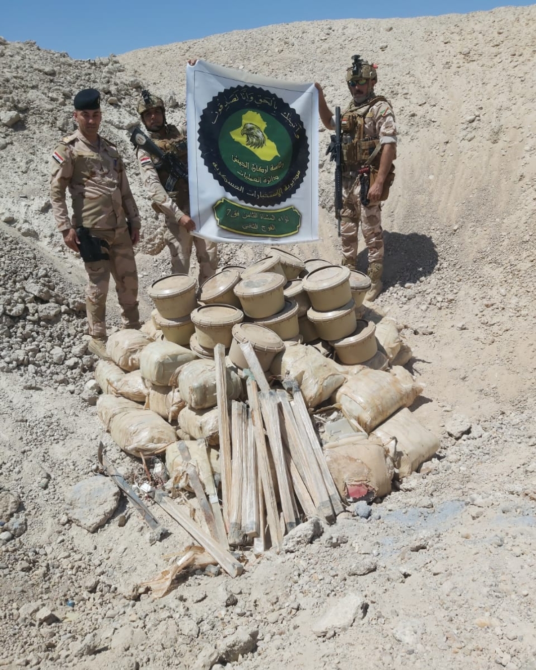 استنادا الى معلومات استخبارية دقيقة لاحد مفاصل مديرية الاستخبارات العسكرية في وزارة الدفاع- قسم استخبارات قيادة عمليات الانبار – والتي اكدت وجود عدد كبير من العبوات الناسفة من مخلفات داعش الارهابي في ناحية الريحانة التابعة لقضاء عنه بمحافظة الانبار تحركت على اثرها مفارز شعبة الاستخبارات العسكرية في الفرقة السابعة وبالتعاون مع الفوج الثاني لواء المشاة الثامن نحو الاماكن المحددة لها وتضبط ٤٤ عبوة ناسفة محلية ضد الدروع،و٤٣عبوة ناسفة على شكل جلكان سعة 20لتر ،و٣٣ صاعق تفجير،
