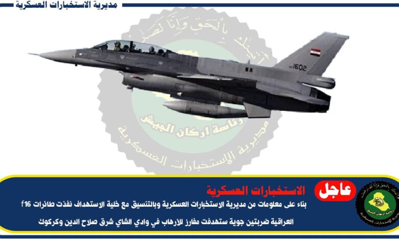 بناء على معلومات مديرية الاستخبارات العسكريةوبالتنسيق مع خلية الاستهداف نفذت طائرات F16 العراقية ضربتين جوية ستهدفت مفارز للأرهاب في وادي الشاي شرق صلاح الدين وكركوك