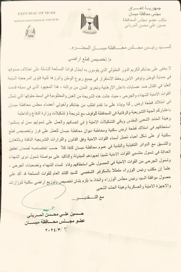 ناقش عضو مجلس محافظة ميسان “حسين المرياني” مع رئيس مجلس المحافظة “مصطفى دعير” ملف تخصيص قطع اراضي سكنية لمنتسبي الحشد الشعبي والجيش والشرطة”.