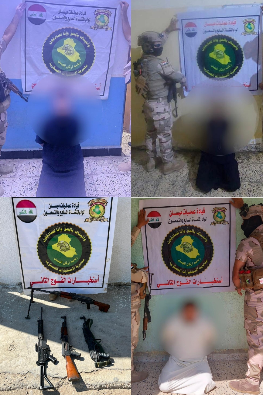 تنفيذاً لتوجهيات قائد عمليات ميسان الفريق الركن محمد جاسم الزبيدي بملاحقة المطلوبين للقضاء والقبض عليهم ، قوة من الفوج الثاني للّواء المشاة السابع والتسعين / قيادة عمليات ميسان ، تلقي القبض على مطلوب وفق أحكام المادة (١/٤ أرهاب) وآخر متهم وفق أحكام المادة (٤٠٥ القتل العمد و ٢/٤ إرهاب) من قانون العقوبات ، وأثنين اخرين من مطلقي العيارات النارية ، فضلاً عن مصادرة عددً من الأسلحة في قضاء المجر الكبير ، وتم تسليم المتهمين والمضبوطات الى الجهات المختصة.
