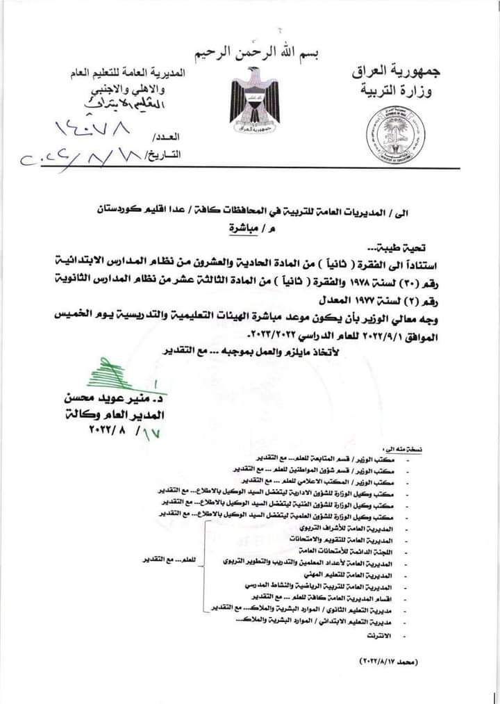 تؤكد وزارة التربية ان يوم غدٍ الخميس الموافق الاول من أيلول لعام 2022 ، موعد مباشرة الهيئات التعليمية والتدريسية في جميع مدارس البلاد للعام الدراسي الجديد 2022 – 2023 ، فيما بينت ان الهيئات التعليمية المكلفين منهم بمهام امتحانية سوف تعتبر لهم مباشرة تلقائية في مراكزهم الامتحانية .
