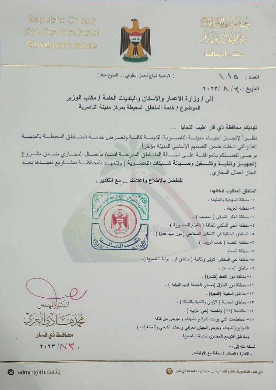 محافظ ذي قار يفاتح وزارة البلديات للموافقة على شمول كافة المناطق المحيطة بالمدينة بعد ادخالها بالتصميم الاساسي للمدينة مؤخراً ويتعهد بتعبيدها ضمن مشاريع المحافظة بعد انجاز اعمال شبكات الصرف الصحي