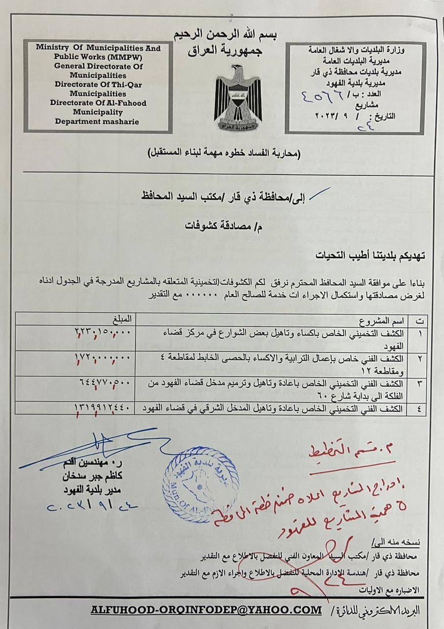 اوعز محافظ ذي قار الدكتور المهندس محمد هادي الغزي، بافتتاح مستشفى الفهود وادراج مشروع لاكمال متطلباته من اجهزة ومعدات وفق كشف فني تعده مديرية صحة ذي قار وتنفذه محافظة ذي قار ضمن تخصيصاتها كما وافق على ادراج عدد من المشاريع المهمة في قضاء الفهود ضمن موازنة ٢٠٢٣ ، جاء ذلك خلال زيارة ميدانية الى القضاء والتقى المواطنين هناك للاستماع الى مطالبهم، من أجل وضع الحلول المناسبة للمشاكل العالقة وإيصال القضاء إلى مرتبة جيدة من الخدمات والعمران .