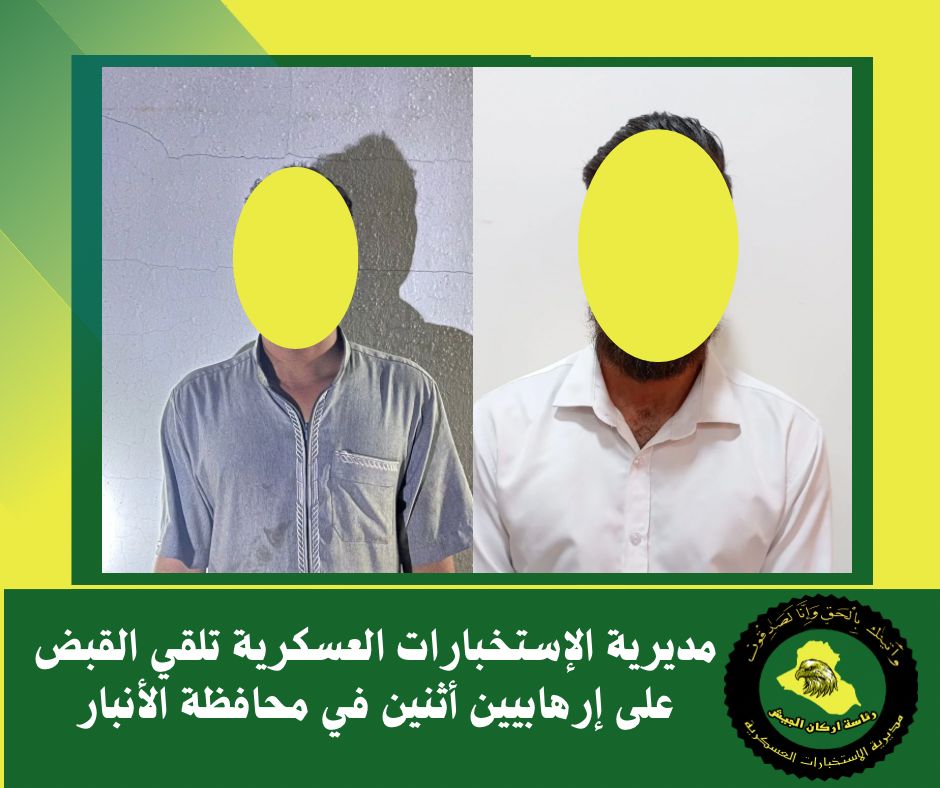بعمليتين منفصلتين نفّذهما ابطال مديرية الإستخبارات العسكرية وبالتعاون مع القوات الأمنية الماسكة للأرض، جاءتا وفقاً لمعلومات استخبارية دقيقة من شعبتي استخبارات الفرقة السابعة والعاشرة، حيث أسفرتا عن إلقاء القبض على إرهابيين أثنين مطلوبين للقضاء العراقي وفق أحكام المادة ( ٤ / إرهاب ) في قضائي راوه والرمادي بمحافظة الأنبار، واللذان كانا يعملان في صفوف عصابات مايسمى داعش الإرهابي، وقد تم تسليمهما إلى الجهات المعنية أصولياً.