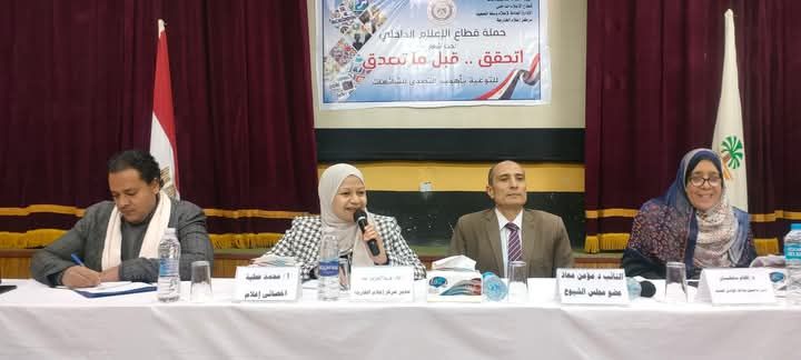 حيث افتتحت اللقاء ا/ أزهار عبد العزيز محمد مدير المركز بالحديث عن أهمية الحملة وأهدافها الرامية إلى نشر الوعى بين فئات الجمهور المتنوعة والتأكيد على ضرورة التدقيق قبل تصديق أو نقل أو إعادة نشر أي معلومة تنشر على وسائل التواصل الإجتماعى وذلك بالتأكد من حقيقة الأهداف التي تقف وراء النشر، وكذا ضرورة الرجوع إلى المصادر الرسمية والموثوقة للتعرف على الحقائق بشأن كل الموضوعات التى يتم الحديث عنها.