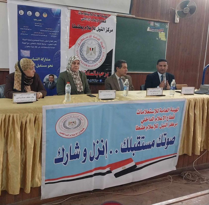 استكمالا لحملة التوعية للمشاركة فى الانتخابات الرئاسية التى تتبناها الهيئة العامة للإستعلامات ” إنزل وشارك … صوتك مستقبلك ” وبالتعاون مع جامعة طنطا تحت رعاية أ.د/ ضياء رشوان رئيس الهيئة العامة للاستعلامات و أ.د محمود أحمد زكى رئيس جامعة طنطا نظم مركز النيل للإعلام بطنطا إدارة إعلام وسط الدلتا ندوة إعلامية حول (مشاركة الشباب نحو مستقبل أفضل) بكلية العلوم اليوم الأحد الموافق ٢٠٢٣/١١/٢٦