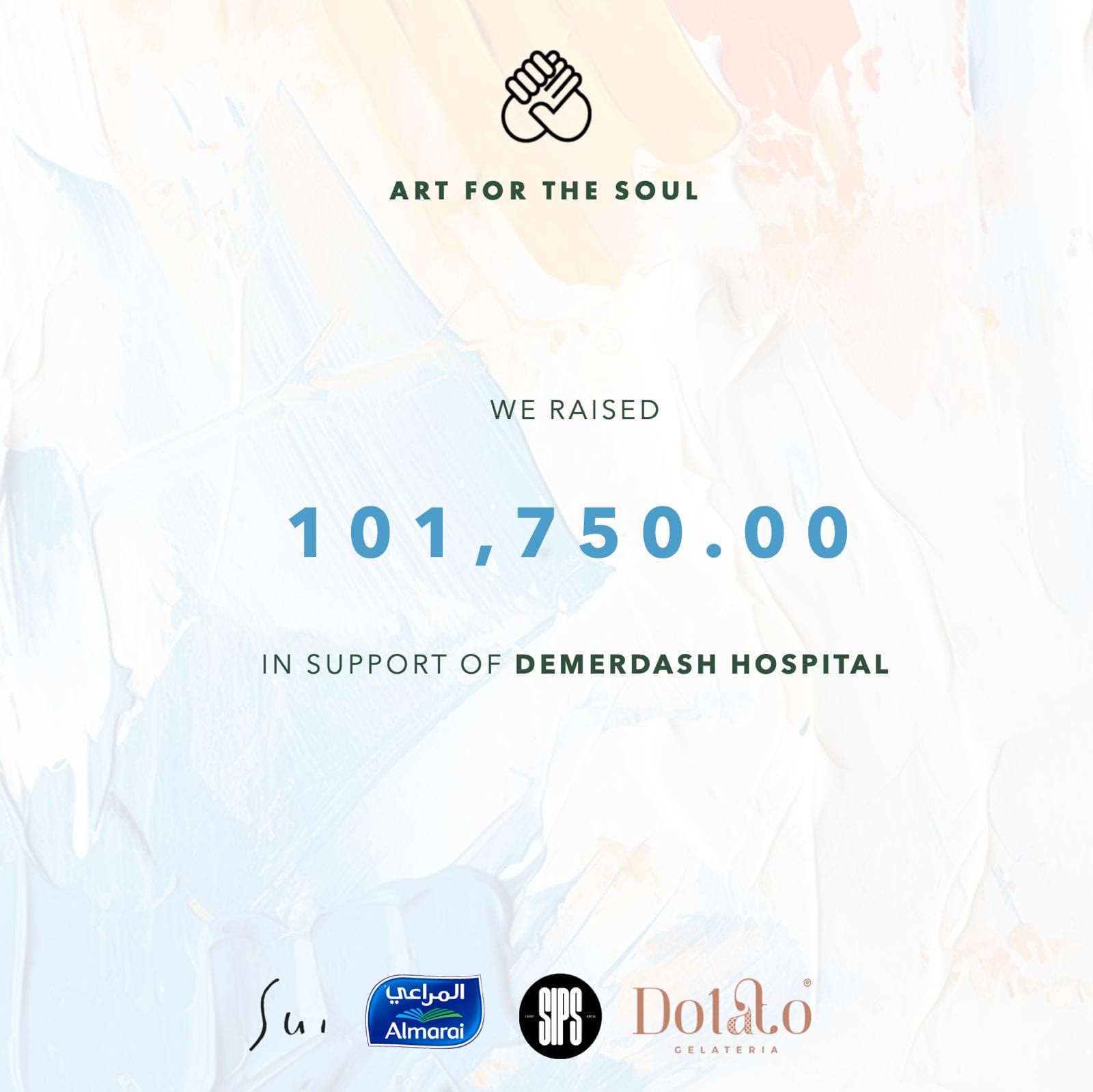 قد يكون تصميم جرافيكس لـ ‏‏مستشفى‏ و‏تحتوي على النص '‏ART FOR ARTFORTHESOUL THE SOUL WE RAISED 101,750.00 101, IN SUPPORT OF DEMERDASH HOSPITAL المراعي Almarai Su, ហា០ Dolal.o CELATERIA‏'‏‏