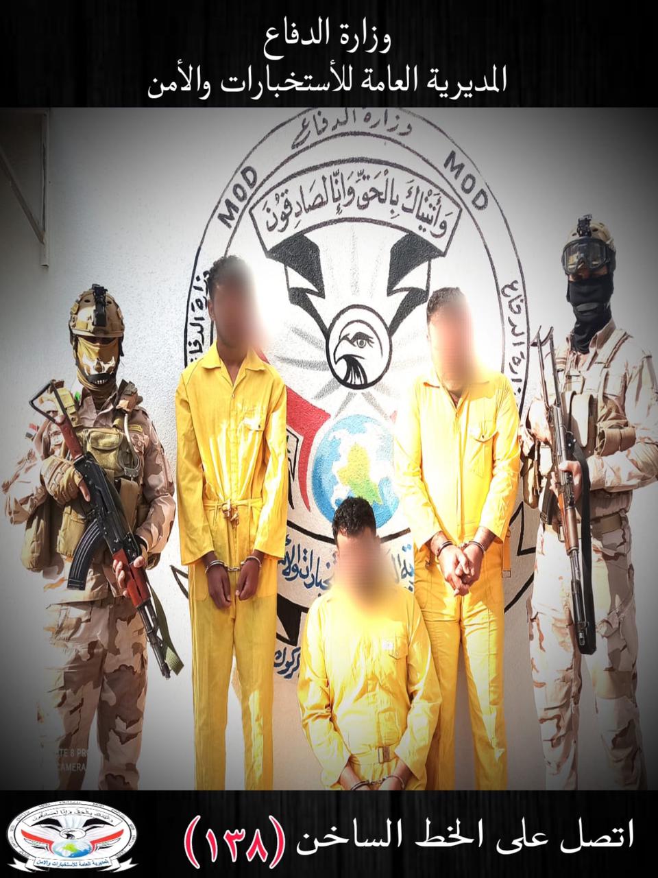 ضمن سلسلة الواجبات النوعية التي ينفذها ابطال المديرية العامة للاستخبارات والامن في وزارة الدفاع وعبر معلومات استخبارية دقيقة، تمكنت مفارز مديرية استخبارات وامن كركوك التابعة الى المديرية انفا وبالتنسيق مع المقر المتقدم لقيادة العمليات المشتركة/ كركوك من الاطاحة بمفرزة خطيرة متكونة من (٣) عناصر تابعة لعصابات داعش الارهابية في محافظة كركوك، حيث كانوا يرمون القيام بعمليات ارهابية تستهدف القوات الامنية داخل المحافظة، صادرة بحقهم مذكرات قبض وفق المادة (٤) من قانون مكافحة الارهاب.