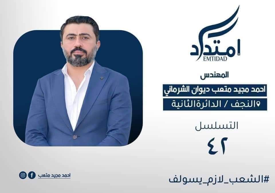 النائب أحمد مجيد متعب الشرماني، كان له دور كبير في العملية السياسية ونشاطاتها على مستوى العراق ونزل مرشحٌ على حركةِ إمتداد للدورة البرلمانية الخامسة بمحافظة النجف على المنطقة الثانية والتي تشمل الكوفة والحرية والعباسية والحيدرية وتأهل الى قبة البرلمان بعد إنسحاب الكتلة الصدرية من العملية السياسية بعدما حصل على اكثر من تسعةِ آلاف صوت .