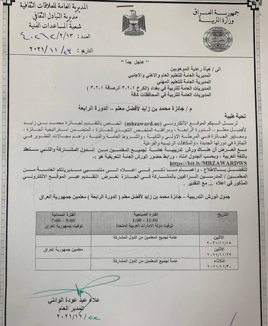 اعلنت وزارة التربية قيام جائزة محمد بن زايد لأفضل معلم باطلاق دورتها “الرابعة” وفتح باب المشاركة للمعلمين والمدرسين في جمهورية العراق .