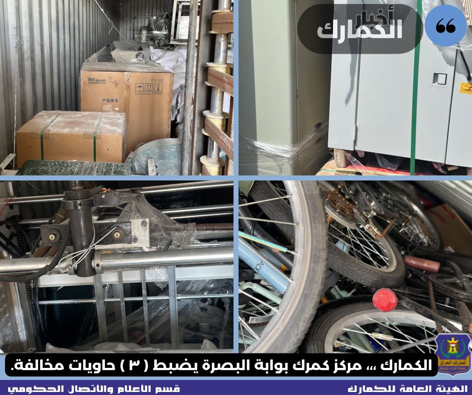 تمكن مركز كمرك بوابة البصرة اليوم الخميس المصادف ١٤ أيلول ٢٠٢٣ من ضبط ( ٣ ) حاويات ( دراجات نارية و هوائية مستعملة ، معمل كامل للتعبئة و التغليف ، اجزاء معمل + مواد اولية لصناعة الغراء ) مخالفة لقانون الكمارك رقم ٢٣ لسنة ١٩٨٤ .