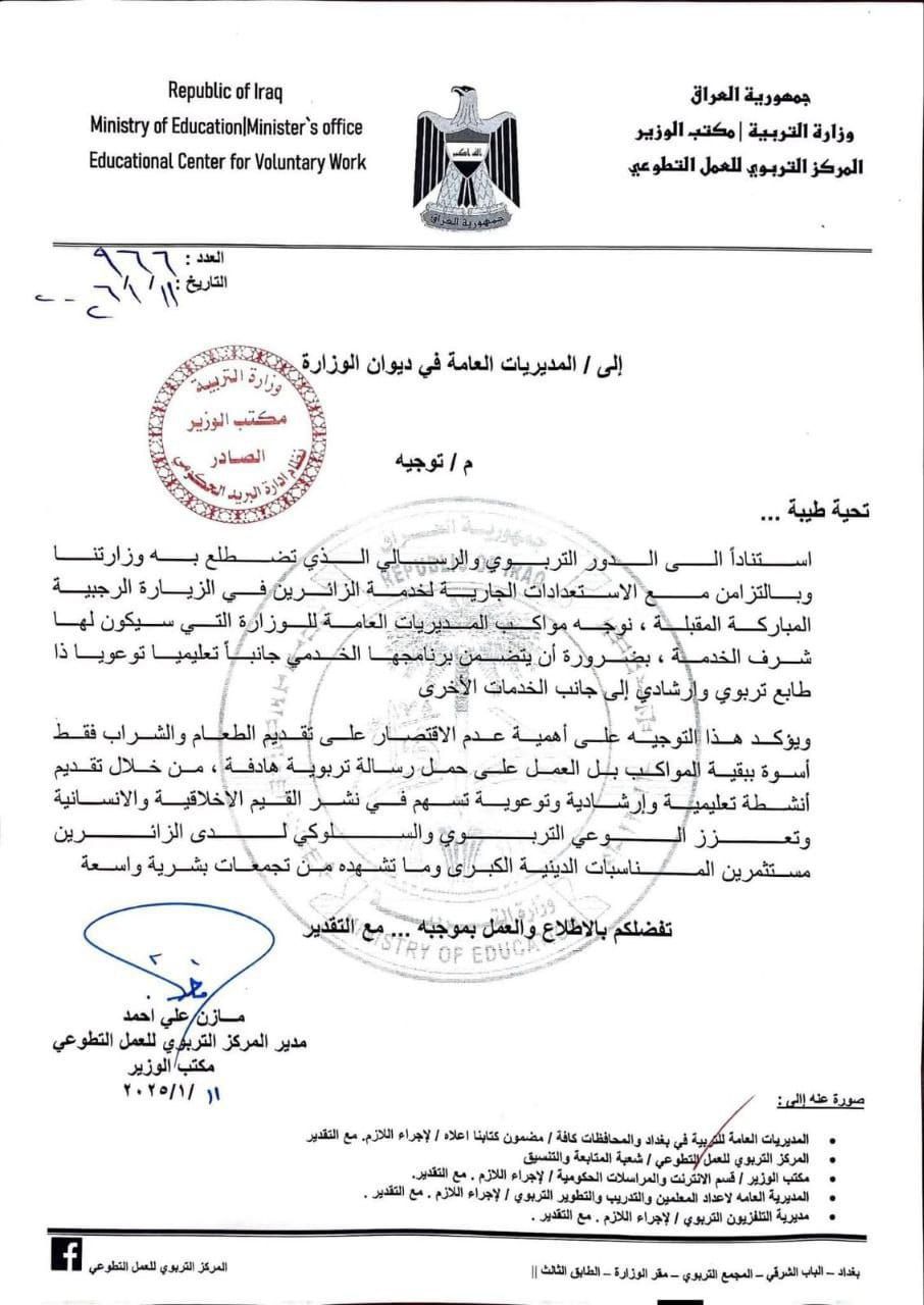 استنفرت وزارة التربية/ المركز التربوي للعمل التطوعي في مكتب الوزير جهودها لدعم الزيارة الرجبية المباركة، وتوجيه المديريات العامة في ديوان الوزارة إلى إسناد مواكب الخدمة الزيارات مع التأكيد على تضمينها الدور التربوي والإنساني، فضلا عن تقديم الخدمات.