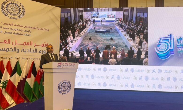 واشار السيد الاسدي خلال كلمته في الجلسة العامة الأولى لأعمال الدورة (51) لمؤتمر العمل العربي المنعقد في القاهرة، بحضور وزراء العمل وأطراف الإنتاج من الدول العربية، إلى أن العراق سيتشرّف الشهر المقبل باستضافة القمة العربية في بغداد، والتي ستجدد بالتأكيد دعمها لقضية فلسطين “قضيتنا المركزية”.