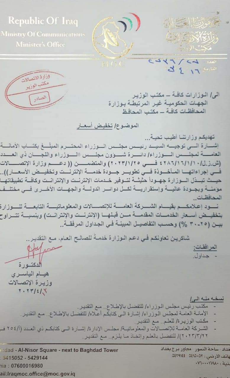 أصدرت وزيرة الإتصالات الدكتورة هيام الياسري أمراً بتخفيض أسعار الخدمات المقدمة من قبل الشركة العامة للإتصالات والمعلوماتية ( الانترنت والانترانيت ) بنسبة تتراوح بين ( ٢٥ – ٣٠ % ) إلى كافة الوزارات والدوائر الحكومية، إستناداً إلى توجيه السيد رئيس مجلس الوزراء المحترم والمتضمن دعم وزارة الإتصالات في إجراءاتها بتطوير جودة خدمة الانترنت وتخفيض الأسعار ، حيث تبذل الوزارة جهوداً حثيثة لتوفير الخدمات وكافة تطبيقاتها بصورة مؤمنة ذات استقرارية عالية لكل دوائر الدولة والجهات الأخرى في مختلف المحافظات ، بالإضافة إلى إستمرار المشاريع الوطنية لتطوير قطاع الإتصالات والمعلوماتية.