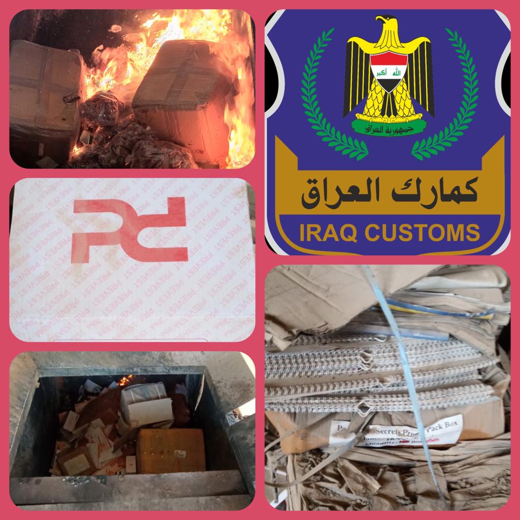 اعلنت الهيئة العامة للكمارك اليوم الأربعاء عن اتلاف ارساليتي كارتون موسوم بعلامة تجارية يستخدم في الغش التجاري من قبل مركز كمرك الشحن الجوي في مطار بغداد الدولي.