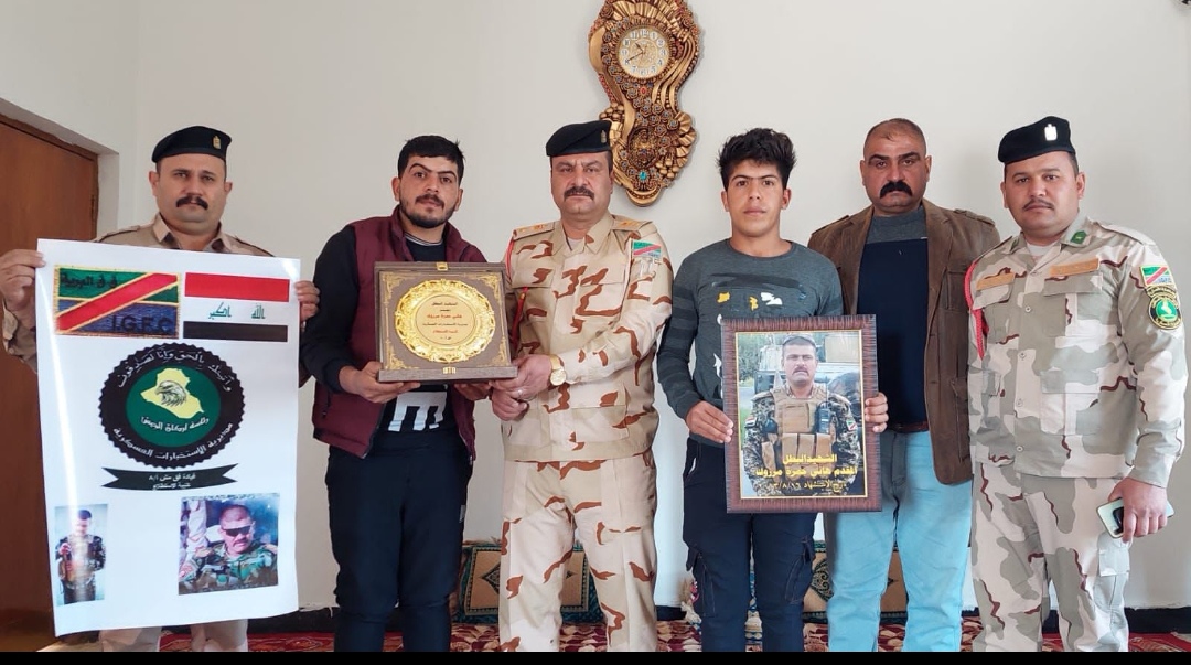 ونقل الوفد تحيات واهتمام السيد مدير الاستخبارات العسكرية اللواء الركن فائز المعموري والسيد قائد الفرقة الثامنة اللواء الركن صالح حرز لعائلة الشهيد وتقديرهما لتضحياته في سبيل العراق وشعبه.
