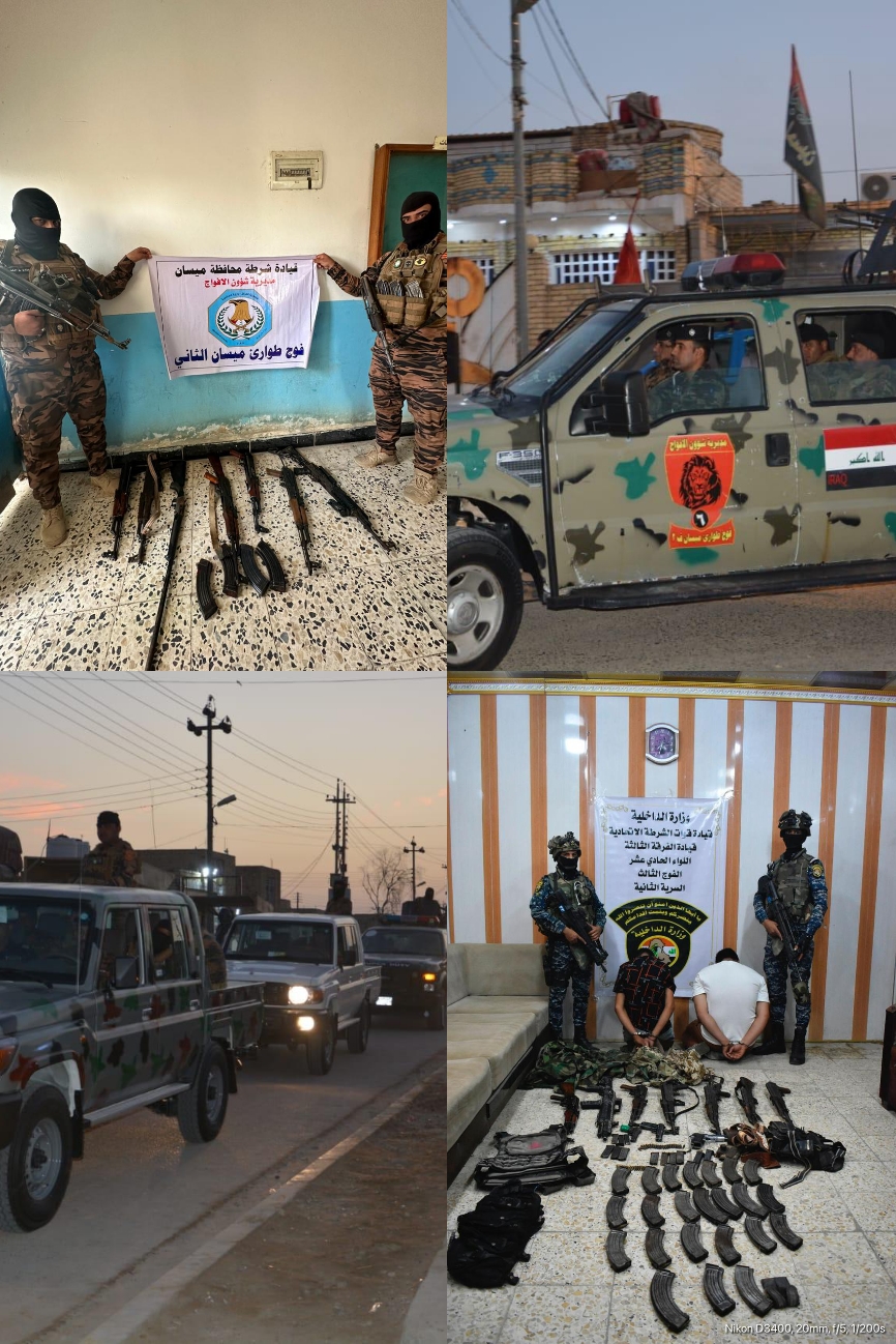 أعلنت قيادة شرطة محافظة ميسان عن تنفيذ عملية امنية استباقية اشتركت فيها قوة من امرية شؤون الافواج بأمرة العميد محمد هادي العيبي وفوج ميسان التكتيكي وسرية سوات في قضائي المجر والميمونة حيث اسفرت عن ضبط (14) قطعة سلاح نوع كلاشنكوف و(2) بندقية صيد و(9) رمانات يدوية.