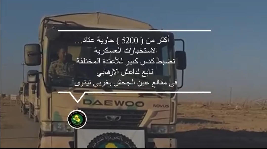 بعملية نوعية وجهد متميز وإستناداً لمعلومات استخبارية دقيقة لشعبة الفرقة الخامسة عشر التابعة الى مديرية الاستخبارات العسكرية وبالتعاون مع استخبارات وقوة من اللواء الحادي والعشرين تم ضبط كدس كبير للأعتدة المختلفة إذ يحتوي على اكثر من ( ٥٢٠٠ ) حاوية عتاد من نوع احادية عيار ١٤،٥ملم والذي يبلغ اكثر من ( ٢٠٨٦٨٠ ) اطلاقة و ( ٥١ ) قنبرة هاون عيار ٨١ملم و ( ٢٣٣ ) حشوة دافعة هاون ٨١ملم و ( ٢٥ ) صاعق تفجير هاون ٨١ملم في منطقة مقالع عين الجحش قاطع عمليات غرب نينوى، تم تسليمه الى الجهة المعنية حسب السياقات المعمول بها