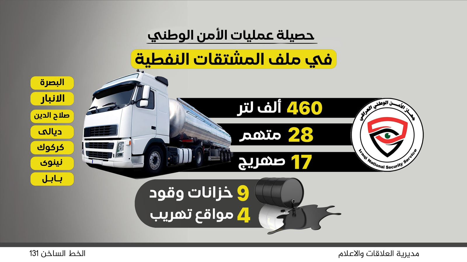 كما وضبطت (١٧) صهريجاً و(٩) خزانات و(٤) أوكار تستخدم لتهريب المشتقات النفطية في محافظات (البصرة، والأنبار، وصلاح الدين، وديالى، وكركوك، ونينوى، وبابل).