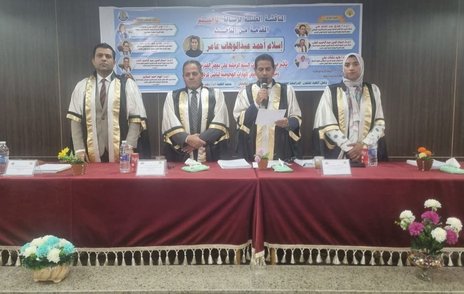 شهد مقر كلية التربية الرياضية الجديد بمقر الجامعة بالكيلو 10 مناقشة اول رسالة ماجستير للباحث اسلام احمد عبد الوهاب عامر تحت عنوان (*تأثير استخدام تتريبات البيئة الرملية علي بعض القدرات البدانيه ومستوي أداء بعض المهارات الهجومية لناشئي كره القدم*) ؛